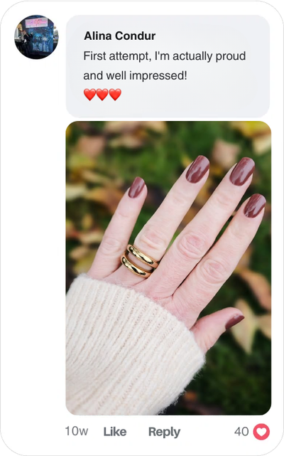 As a busy mom, I was skeptical about finding the time for my nails, but the clear instructions and helpful videos made it so easy. I learned all the little tips to avoid mistakes, and now I couldn’t be happier, my nails look amazing!